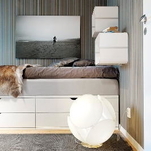 Pense também nos pequenos detalhes que fazem da sua cama um elemento de decoração. Para uma sensação minimalista e clean, considere usar um mecanismo de abertura e fechamento por toque, assim você não vai precisar de alças, ou incorporar cavas às gavetas.