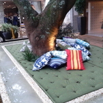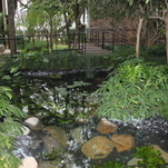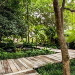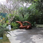 Logo ao chegarmos, fomos acolhidos com maestria pelo suntuoso Bosque Tropical, de Gilberto Elkis – um jardim com espécies tropicais exuberantes, lago com peixes e sons da natureza que traziam um clima de tranquilidade. Era preciso passar por ele, entre a mata, para ter acesso aos demais espaços da mostra.