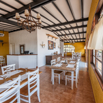 “Mesas de madeira maciça e cadeiras foram escolhidas para oferecer conforto e aconchego. Os tijolos pintados de branco adicionam um toque de leveza e amplitude ao ambiente”.